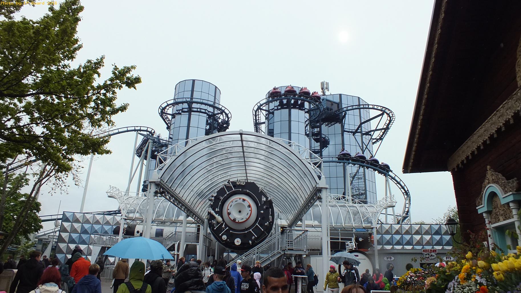 Was ist das? Euro-Mir ist eine Achterbahn mit Weltraum-Thematisierung. Zuerst geht es im Trommellift nach oben. Danach fahren die Züge um die Türme. Schlie